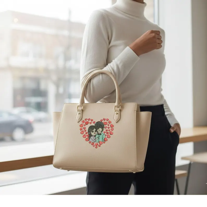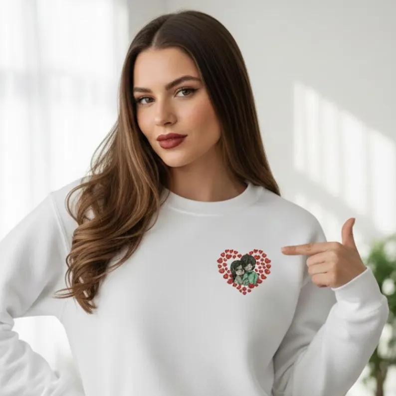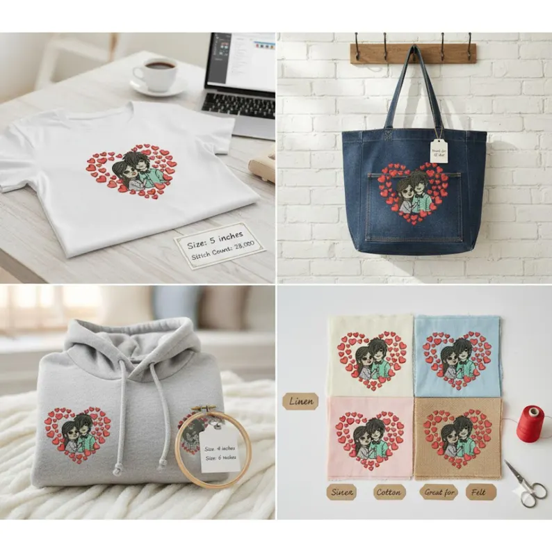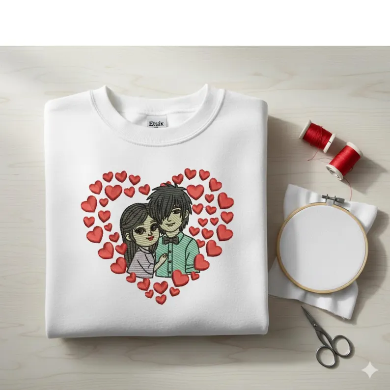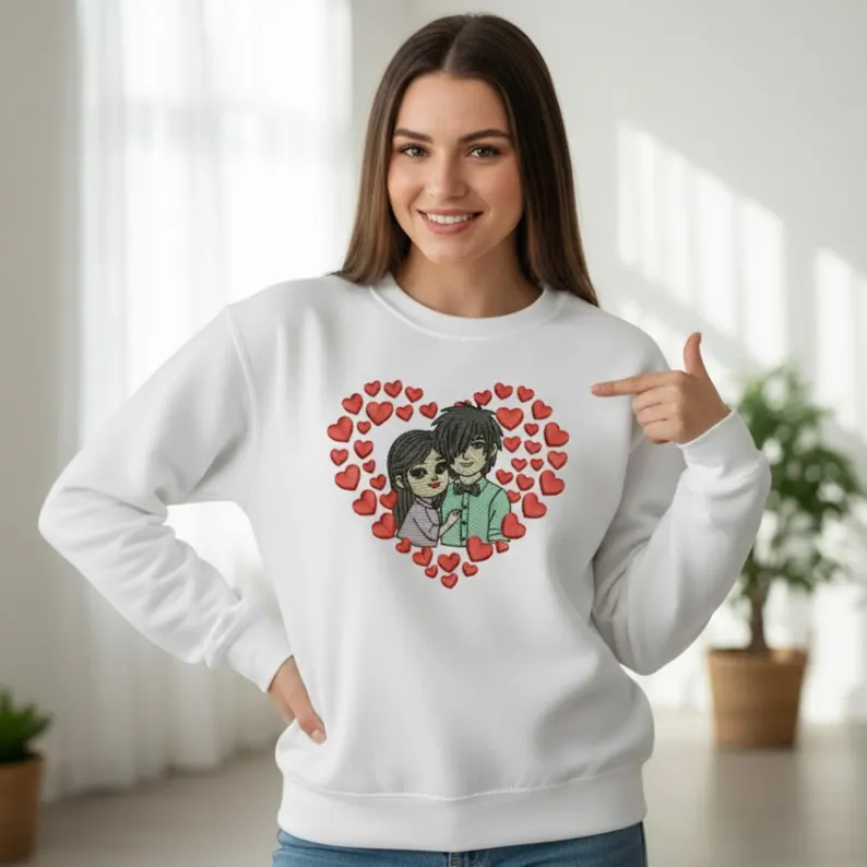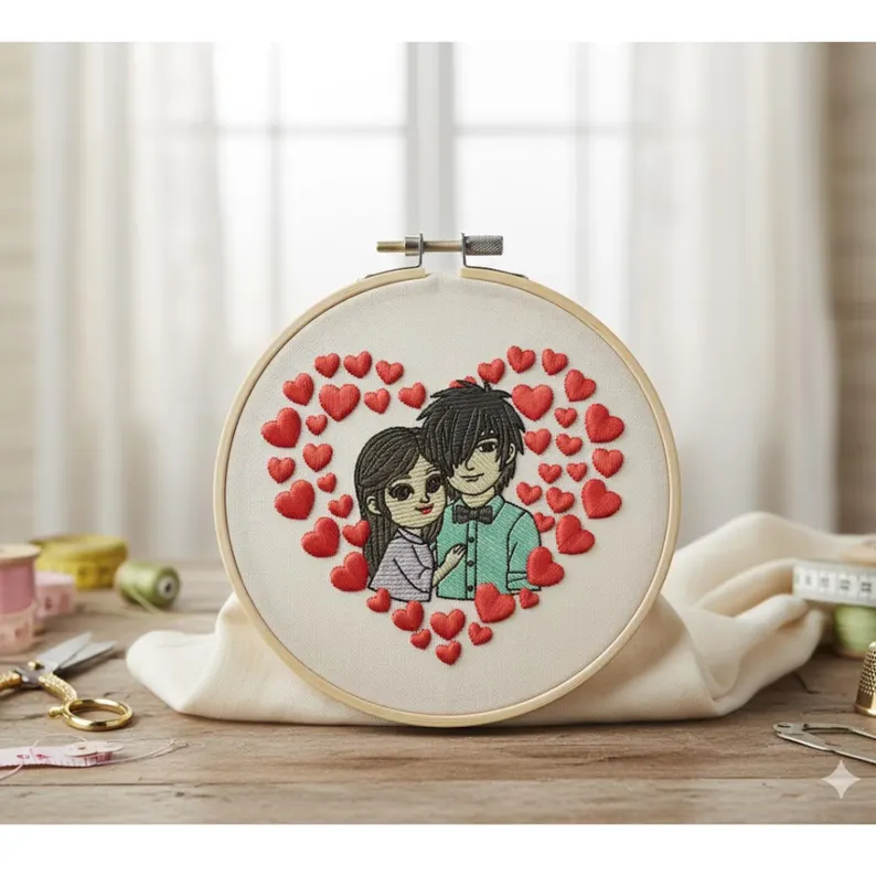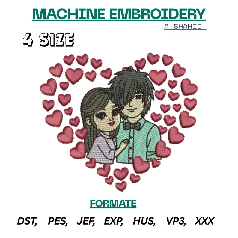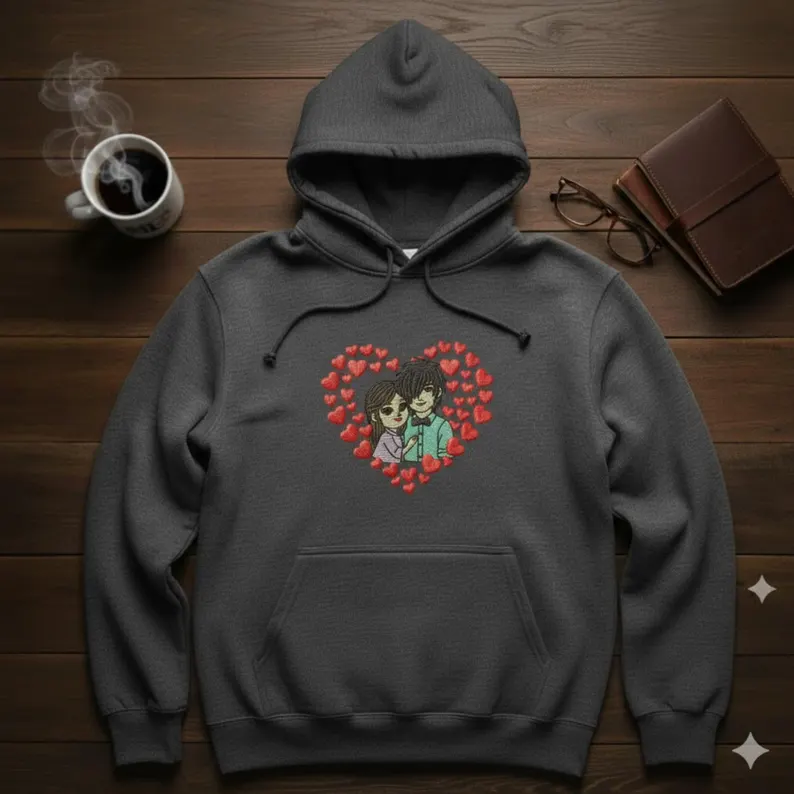 A cute romantic couple embroidery design surrounded by hearts, perfect for Valentine’s Day, gifts, hoodies, and custom apparel. Includes multiple sizes and machine formats for instant download.